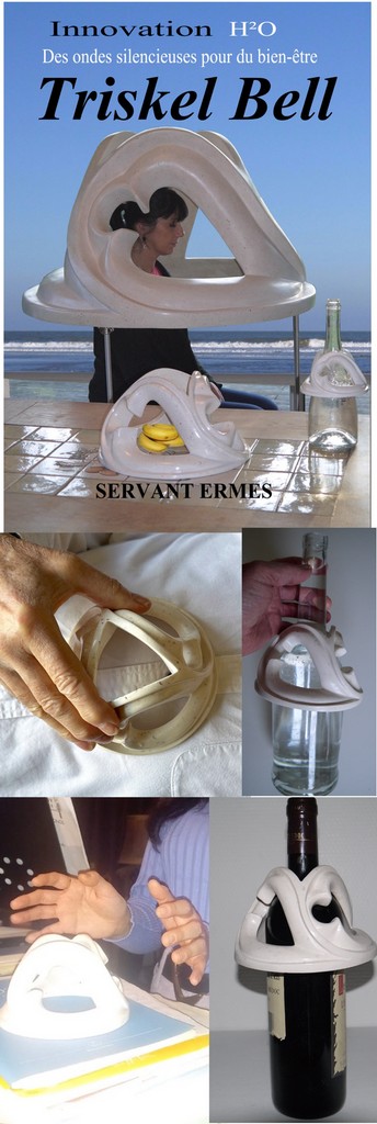 Mais Servant Ermes est inventeur et l’histoire se poursuit car il n’y a pas de hasard, il travaille aussi sur l’origine des particules élémentaires de l’Univers et notamment sur l’équation du vivant au cœur de l’atome de l’hydrogène née il y a 13 milliards d’années. Créer un triskel en forme de cloche pyramidale qui rappelle la géométrie du proton est une démarche créative intuitive, c’est aussi un véritable pont d’innovation entre art, science et humanité pour le bien-être. Ainsi le Triskel Bell se connecte entre terre et ciel, devient un transmetteur d’ondes silencieuses bénéfiques au vivant. Sa conception permet par l’émission d’ondes scalaires de vitaliser la molécule d’eau par ses protons H₂. Il semblerait que l’angle entre l’oxygène et des deux hydrogènes de la molécule d’eau soit modifié passant de 104,5° vers les 108° ce qui tend à correspondre à la géométrie du pentagone qui est la base de la règle d’or.
