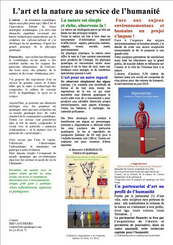 More committed than ever in combating pollution, 'the electron pump' project by Servant Ermes is revolutionary, not only in terms of technology but also in terms of its original financing method: Art for Science! A transition towards clean electrical energy will prove beneficial to the people of tomorrow. Based on the author's innovative works, this theory will further develop from sales of quantum art pieces entitled 'the quantique world brought to light'. Purchasing such artworks will become a useful and gratifying investment for these sponsors.